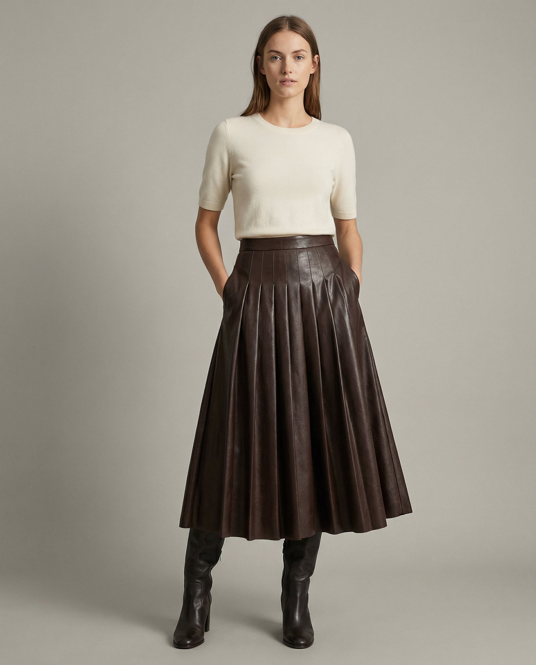 Drama in the details. The Pleated Faux Leather Midi Skirt brings structure and movement together in one statement piece. Deep pleats cascade from a fitted waistband, creating a full, feminine silhouette that commands attention at any event. Wear it with a fitted knit top and ankle boots for a look that's entirely your own.